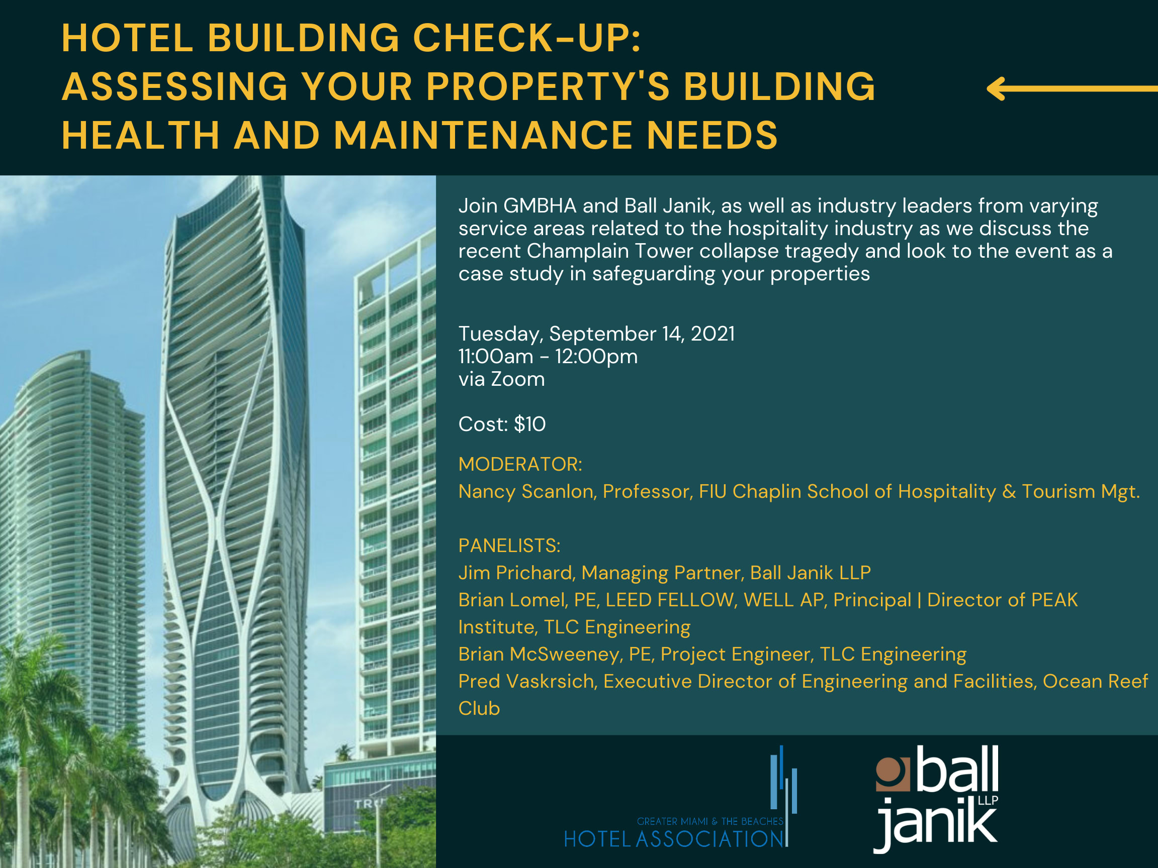 Join GMBHA and Ball Janik, as well as industry leaders from varying service areas related to the hospitality industry as we discuss the recent Champlain Tower collapse tragedy and look to the event as a case study in safeguarding your properties